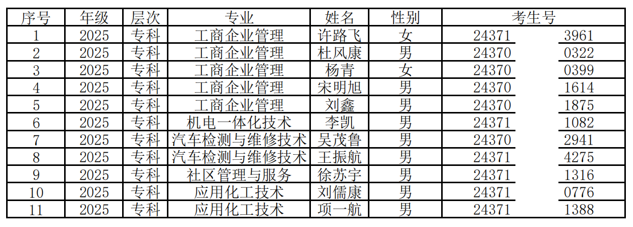 截至到2025年3月20日,我校2025级有11名新生未按要求报到入学,也未按规定办理请假手续,现将录取未报到的新生名单予以公示(具体名单见附件一),请名单中所列的录取新生看到此公示后务必于2025年4月20日前携带个人身份证及相关证明材料等到我校办理报到手续或有关机构报到。